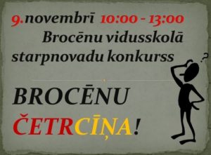 9.novembrī jau astoto gadu pēc kārtas norisinājās “Brocēnu četrcīņa 2017”. Šo starpnovadu konkursu dabaszinību priekšmetos un matemātikā organizēja skolotājas V.Banzena, D.Dubulta, O.Ļitvinova, A. Milta, V. Mielava, M. Skrastiņa, D. Virkstene, bet komandu sacensību organizēšanā palīdzēja visi 8.a klases un divas 8.b klases meitenes, 12.b klases skolēni E.Milnis, A.Paštore, J.Sušinska, M.Petrova. Šogad pie mums viesojās rekordliels dalībnieku skaits – 80 devīto klašu skolēni no 15 skolām un 4 novadiem.